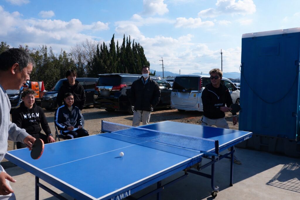 餅つきの合間に即席の卓球大会が始まり、意外なラリーの応酬に大盛り上がり!