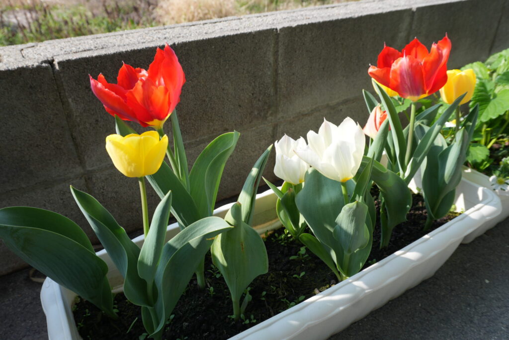 以前、みんなで植えたチューリップが、ついにきれいに咲きました🌷