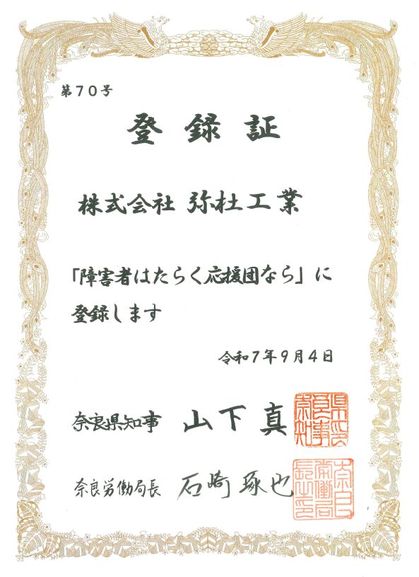 このたび弊社は、2025年9月4日付で奈良県が推進する「障害者はたらく応援団なら」に登録しました。